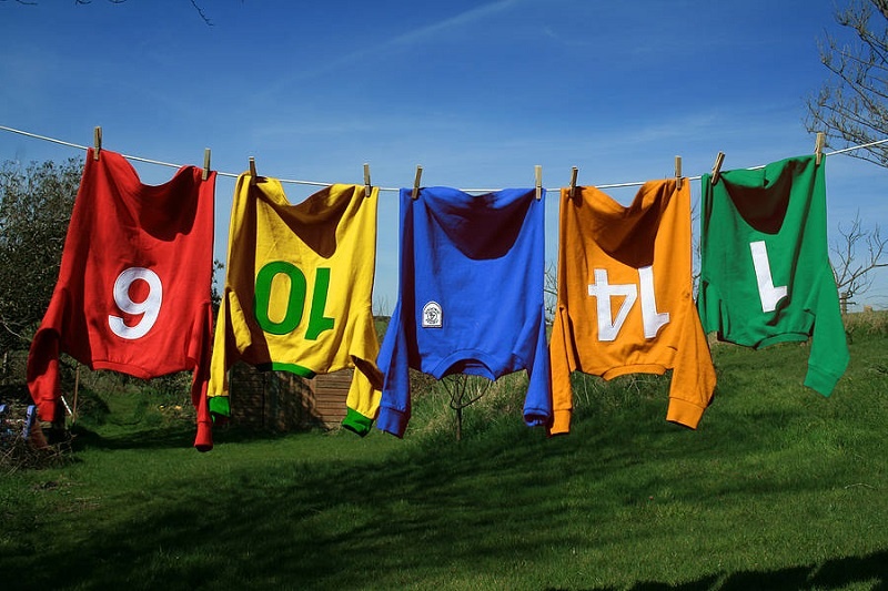 • Khi phơi nên phơi ngang dây hoặc sào. Nếu muốn treo lên móc áo, bạn nên vắt kiệt nước để tránh làm quần áo bị giãn. Treo quần áo trong bóng râm tránh ánh nắng trực tiếp sẽ giúp logo, tên và số lâu bị hư hỏng.