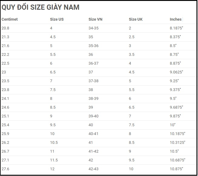 Bảng quy đổi size giày US, size giày UK Nam