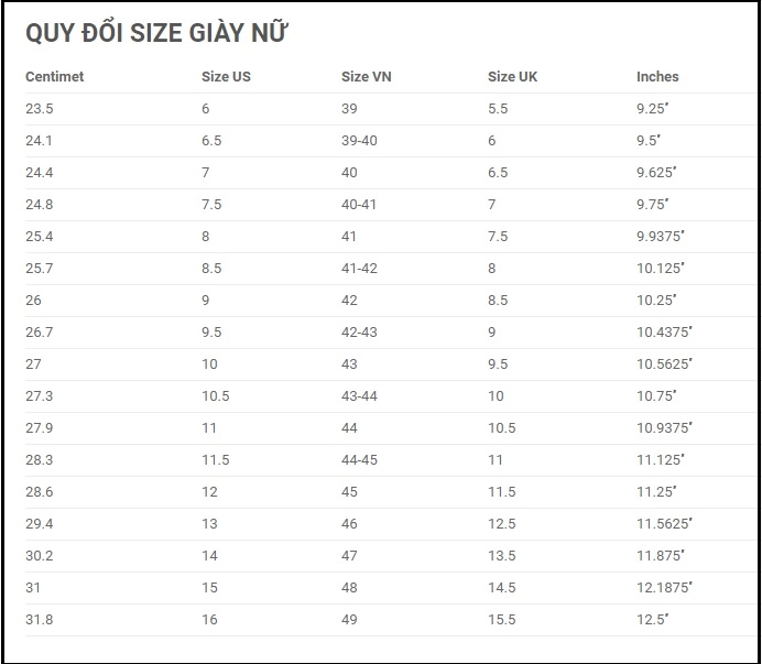 Bảng quy đổi size US, size UK giày nữ